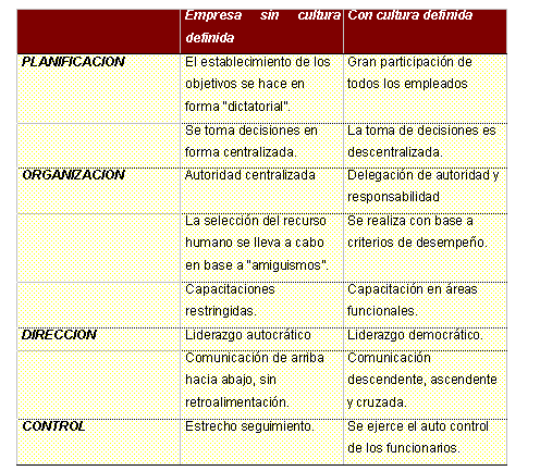 A continuación se presenta una matriz comparativa entre una empresa sin cultura organizacional definida y otra con cultura establecida y clara.